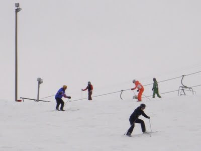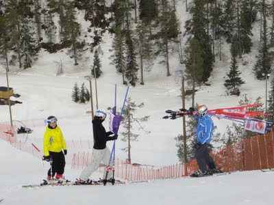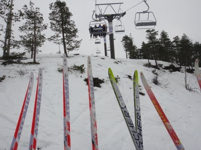 С утра мы вместе расставили трассу по слалому гиганту на FIS склоне с очень серьезным уклоном. После установки флажков мы вместе ее осмотрели и обсудили сложные участки. Трасса получилась серьезная и требовала много сил. Гораздо больше, чем при обычной езде, даже по очень крутым спускам. Перед многими флажками казалось, что ты их безнадежно пролетаешь, но со скрежетом в зубах все же выезжал из сложных ситуаций. Правда фин из нашей команды один раз "выехал" прямо в ограду, пробил ее и вылетел с трассы. Это лишний раз напомнило нам, что скорости при прохождении трассы нешуточные. К счастью он вылетел мимо столба, который был на несколько метров выше. После обеда мы расставили трассу слалома, но ее пришлось делать сравнительно простой, т.к. за первую половину дня снег уже изрядно раскис.