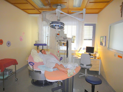 Акушерка проверила раскрытие матки, оно было только 2 см, и мы отправились немного поспать. Утром нам сказали, что у меня слишком слабые схватки, но покидать больницу уже нельзя. Так мы весь день нагуливали схватки по территории больницы. Эта одна из крупнейших больниц в Тироле, сюда привозят пострадавших со всего региона. Постоянно летают вертолеты. Само же родильное отделение небольшое, есть: приемная, несколько родильных залов, послеродовые палаты, кабинеты для обследований, маленькая столовая. В то же время отношение очень серьезное, например, при нас одну из рожениц по какой то причине отправили на вертолете в Инсбрук. Что еще интересно, родильный зал, в котором в течении дня меня несколько раз обследовали, был только мой, т.е. до окончании моих родов туда никого больше не пускали. В свою очередь акушерки менялись каждые 8 часов, так я успела познакомится с 3-мя. Причем, последний раз смена происходила уже во время активных схваток: акушерка просто пришла и сообщила, что принимать роды будет продолжать ее коллега. Наверное, это правильно, ведь наверняка человек может гораздо эффективнее отрабатывать смену 8 часов, нежели смену в несколько суток.