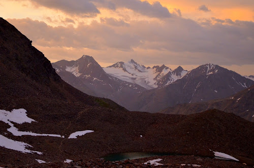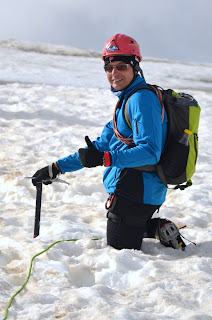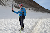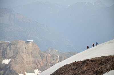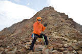 Вот перед нами и заключительный подъем. Это просто скалы с камнями, безо льда. Снимаем кошки и оставляем рюкзак Влада у подножья и идем вверх. Мой рюкзак берем с собой, так как там самое ценное - провизия :). Подъем достаточно крутой, шириной около метра. С одной стороны от нас огромный обрыв, а с другой уклон градусов 70, который заканчивается ледником. Так что оступаться не хочется ни в одну из сторон. Еще немного и мы достигаем заветную высоту 3774 метров над уровнем моря. Путь от хижины у нас занял немногим больше 4-х часов.