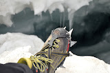Если встать на такой камень, он просто соскальзывает вниз. И мы принимаем решение одевать кошки, и продолжаем путь. В кошках стараемся не наступать на камни, т.к. они по прежнему могут легко соскользнуть Подъем идет достаточно круто вверх, и мы начинаем идти серпантином. При этом, ноги в кошках надо ставить на лед плоско, иначе можно подвернуть ногу или просто соскользнуть. При этом важно было не идти сразу за другими людьми, если вдруг кто-то поедет вниз, он может серьезно поранить своими кошками.