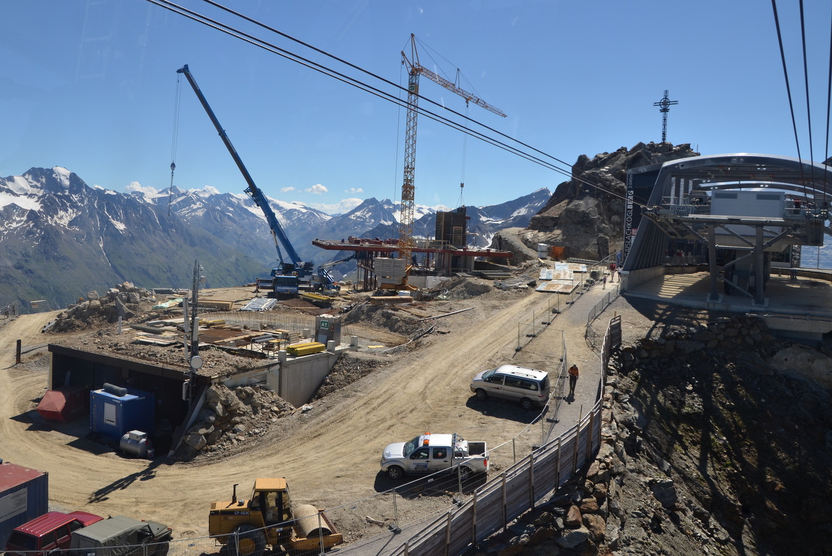 Так что мы решили заодно подняться наверх Гайслахкогель. Еще раз посмотреть, как знакомые места выглядят летом. А заодно оценить как продвигается стройка нового ресторана. Смотря на стройку, забываешь что находишься выше 3000 метров над уровнем моря. На стройке установлен обычный кран, по горнолыжной трассе построена грунтовая дорога, по которой передвигаются обычные грузовики. Даже несколько машин припаркованы на территории. Хочу заметить, что старая смотровая площадка на вершине разобрана, вместо нее будет смотровая площадка на крыше ресторана. Ресторан планируется с эксклюзивной европейской кухней на уровне отеля централь. Вместимость ресторана 130 мест в помещении и еще 80 на террасе. Наверху с огороженной стройкой и без смотровой площадки оказалось достаточно тесновато, так что едем вниз на подъемнике.