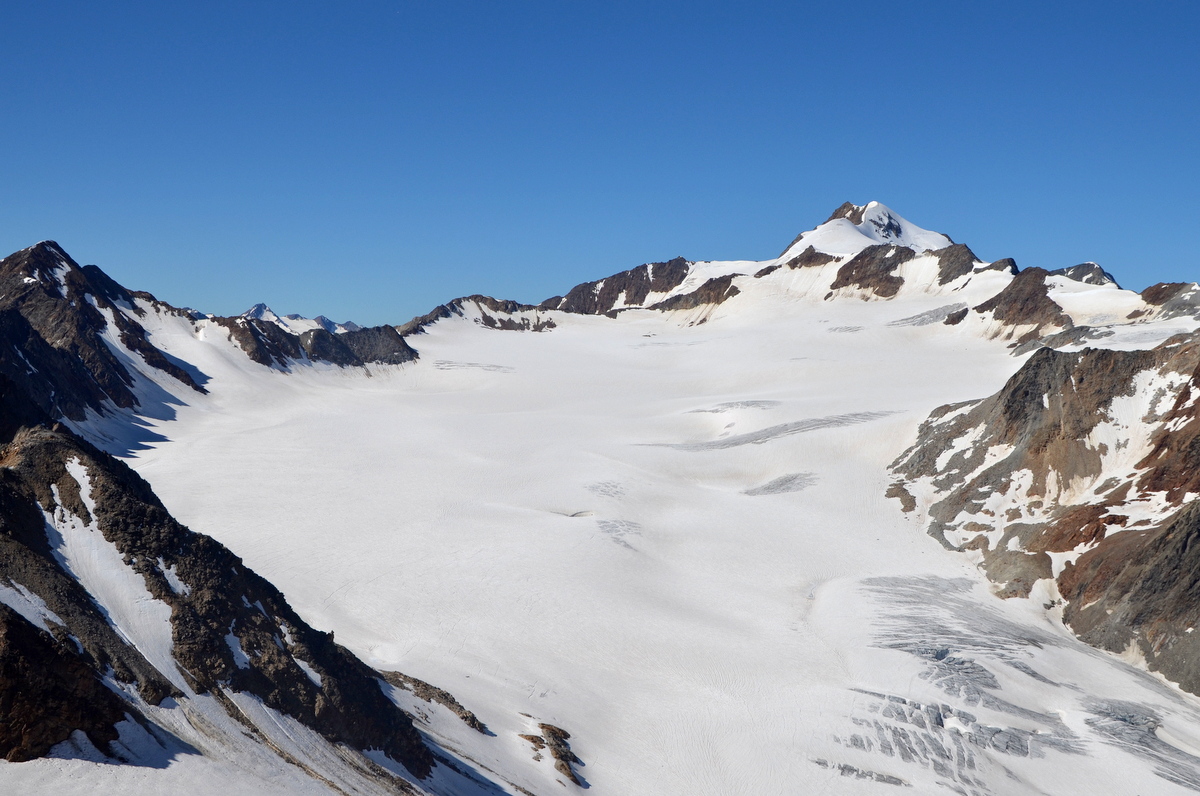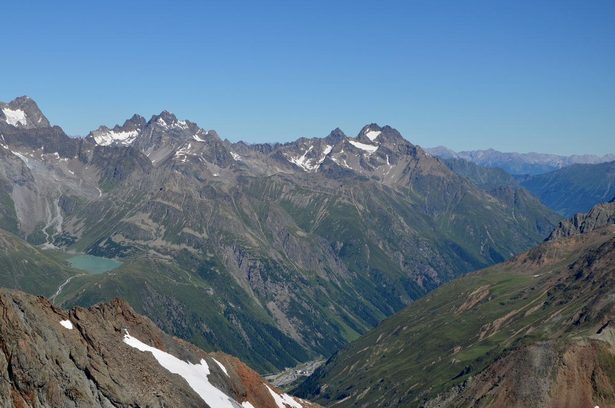 Вот мы и на высоте 3250 метров! Идем на, уже ставшую родной, смотровую площадку, а оттуда по прежнему открывается замечательный вид. Вот самая высокая гора в Тироле - Вильдшпитце, по прежнему белоснежная. Правее видим курорт Пицталь, на котором тоже работает подъемник, он тоже отдает белизной. Ну а дальше открывается вид на долину с зеленым лесом и серыми скалами. Вид завораживает, но надо двигаться дальше, ведь впереди у нас еще длинный путь.