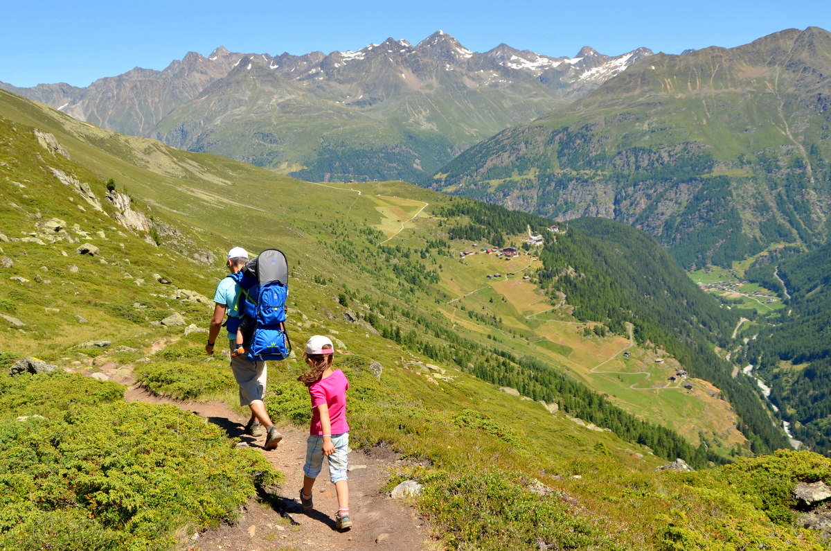 Нам хотелось посмотреть не только те места, где мы уже были зимой, но и открыть для себя Зельден с новой стороны. При этом некоторые ограничения накладывало то, что мы шли с двумя детьми. Моей дочери 5 лет и она должна была самостоятельно осилить путь, а годовалый сын планировал провести весь путь в специальном рюкзаке. Мы выбрали маршрут от ледника Тифенбах до средней станции Гайслахкогель. Этот маршрут, протяженностью примерно 10 км, предполагается пройти за 3,5 часа. Забегая вперед скажу, что у нас путь занял дольше.