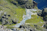 Спускаемся вниз и следуем через огромную но пустую парковку Тифенбаха, далее еще 100 метров в сторону тоннеля. Вот и закончилась приличная дорога на ближайшие несколько часов. Попадаем на узкую тропинку с множеством камней. Ну ничего, мы подготовили себя к трудностям, так что двигаемся дальше. Практически сразу виды завораживают. Справа бежит скалистый ручей а спереди начинает виднеться живописная долина Вентерталь. Дорога идет под постоянным уклоном вниз. Вскоре открывается шикарный вид на огромный зеленый луг внизу, по которому вьется маленькая речушка, которая заканчивается водопадом. Даже дочь восклицает какая вокруг красота!