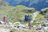 Добираемся до сказочного луга, вблизи он не менее красив. Ну а дальше начинается все самое веселое.Оказывается до этого спуск вниз был совсем пологий. Приходится двигаться медленнее. Периодически подошва проскальзывает, но мы аккуратно следуем вперед. Местные жители с походными палками обгоняют нас в хорошем темпе. Двадцати килограммовый рюкзак с сыном становится нести все тажелее, дочь тоже начинает уставать. Она говорит: "Природа вокруг конечно красивая, но я уже готова заканчивать наш поход". А мы прошли только половину пути. Мой сын Эрик мужественно сидит в рюкзаке, но качка при ходьбе усыпляет его. Жена замечает, что головка у него сильно болтается, так что стараюсь идти ровномернее.
